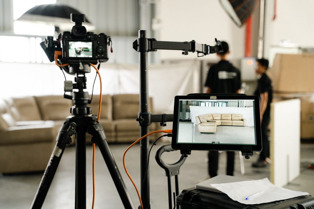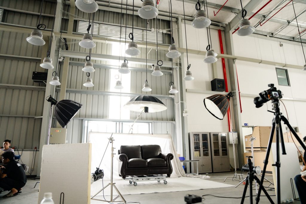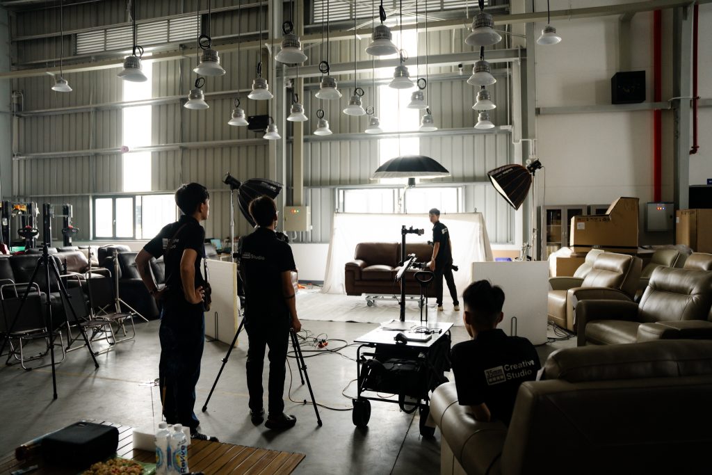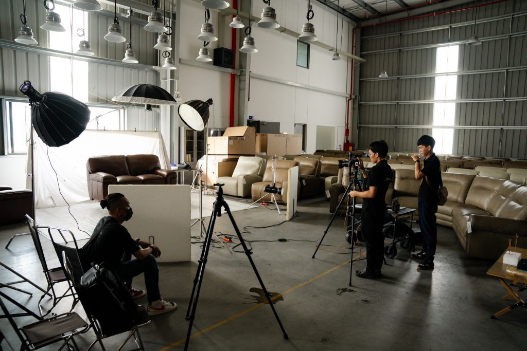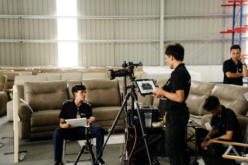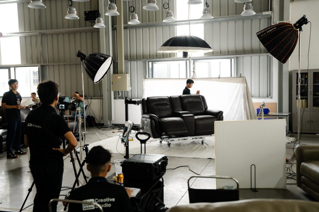 Như bạn thấy trong những hình ảnh hậu trường, thay vì cố gắng di chuyển những bộ sofa nặng nề vào studio chật hẹp, team 35mm.vn đã thiết lập một “phim trường dã chiến” ngay tại kho hàng của khách.