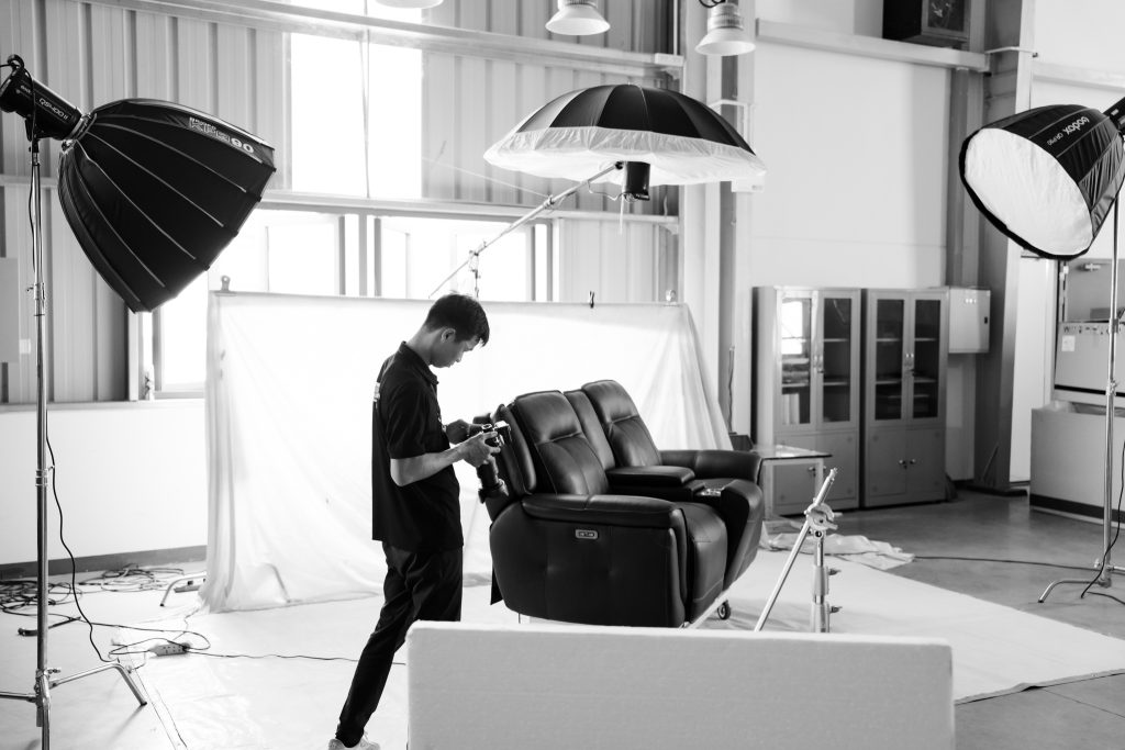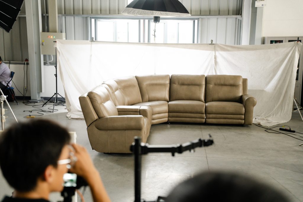 Với các dòng nội thất xuất khẩu (đặc biệt là thị trường Mỹ, Âu), sản phẩm thường có kích thước rất lớn (Oversized), bề thế và nặng nề. Cái khó của người nhiếp ảnh gia không chỉ là góc chụp, mà là Không Gian và Ánh Sáng. Làm sao để ánh sáng phủ đều lên toàn bộ bề mặt da rộng lớn mà không bị chỗ cháy sáng, chỗ tối om? Làm sao để sản phẩm trông sang trọng, mềm mại chứ không phải là một khối vật thể cồng kềnh?